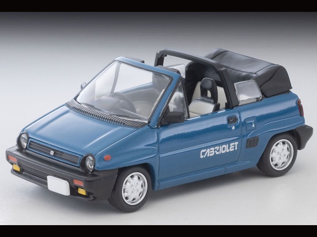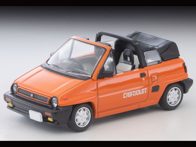 □ トミーテック - ホンダ シティ カブリオレ84年式トミカリミテッドヴィンテージ NEOシリーズ。1/64サイズ。2022年4月にLV-N262a(水色)が3190円で発売(藤)、2023年11月にLV-N262b(白)が3410円で発売(うづ)、2026年7月にLV-N262c(オレンジ)とLV-N262d(ブルー)が3960円で発売(kazzee)、本品はnekotasan号(黒CABRIOLET)の3Dスキャンデータに基づいて開発(Saka)。