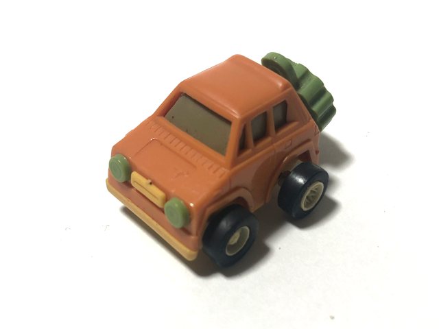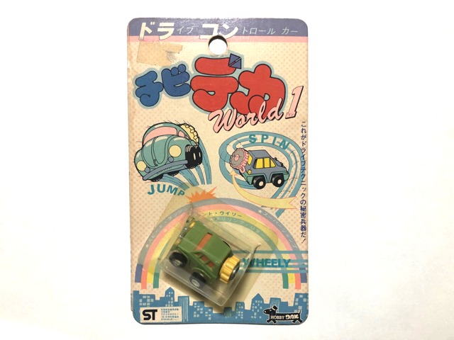 □ ホビーダックス - チビデカ World1全長33mm。プルバック動力で走行。背面の「ドラコン・ウエイト」ダイヤルの操作位置により5種類の走行動作が可能。茶色(kazzee)の他に黄色とオリーブ色(みそ)あり。