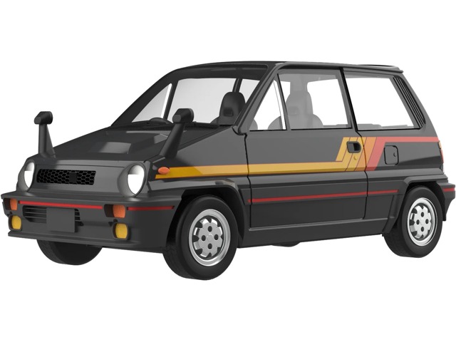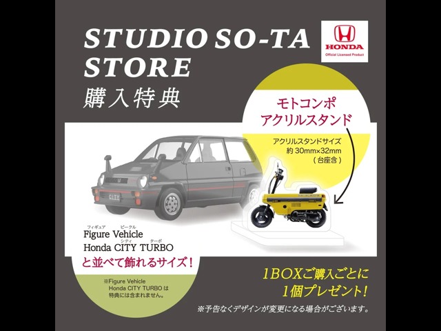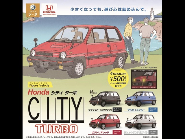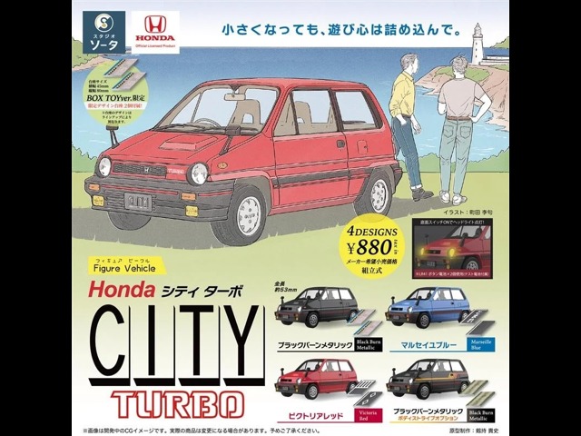 □ スタジオソータ - Honda CITY TURBOFigure Vehicleシリーズ。全長53mmnのABS素材のフィギュア。ヘッドライト(電池付属)が光り、タイヤが回転。1回500円のカプセルトイ仕様、1個880円のボックストイ仕様があり。色はブラックバーンメタリックの他、マルセイユブルー、ビクトリアレッド、ジェットランドホワイト(カプセルトイ限定)、ブラックバーンメタリック・ボディストライプオプション(ボックストイ限定)あり。ボックストイには色ごとに専用の台座が付属し、ブラックバーンメタリック台座、マルセイユブルー台座、ビクトリアレッド台座、ブラックバーンメタリック・ボディストライプオプション台座がある。また2025年11月19日までに「SUTUDIO SO-TA STORE」でボックストイの予約をすると、限定特典としてモトコンポ・アクリルスタンドが付属する。