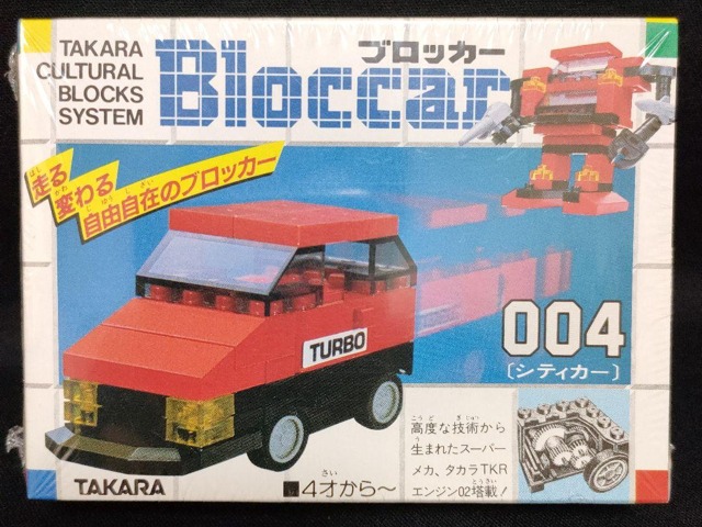 □ タカラ - 004シティカー【判定困難】ブロッカーシリーズ。ブロックを組み替えて車やロボットに変化。全長約60mm。プルバックで動作。