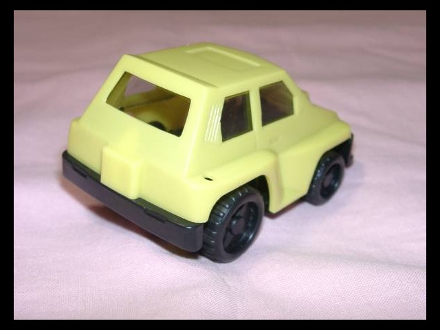 全長約75mmの車体(動力なし)と、ドライブスルーまたはガソリンスタンド、交通標識・デカール・ラムネが付属する食玩。黄色の他に赤色、白色あり。